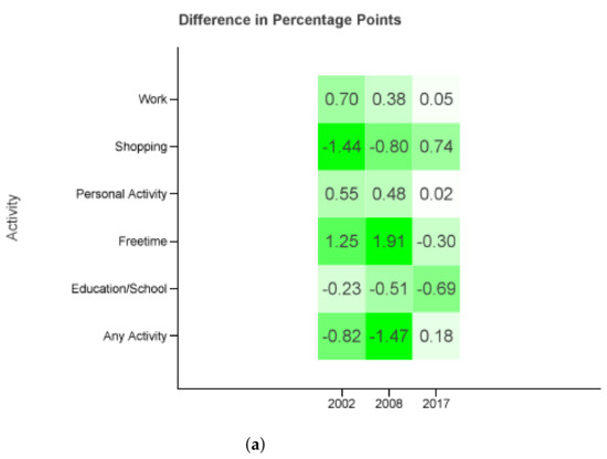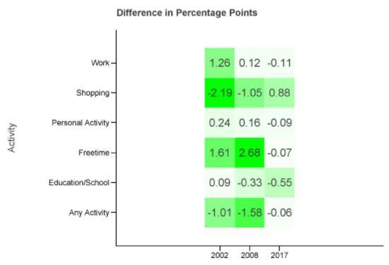 Figure 7 displays the differences of the combinations of . Comparing it to Figure b one can see that the absolute maximum error decreases from 3.34 to 2.68 percentage points. In fact, there are two cells (shopping and personal matters in 2017) with a bigger and one cell (shopping in 2002) with the same absolute difference. All other activities and years are closer to the MiD data.