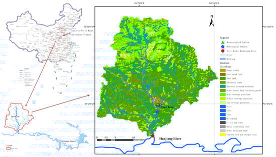 This study was conducted in the Tianhe River watershed, located in the middle area of China (Figure 1). The Tianhe River originates from the eastern side of Taiping Mountain in Shaanxi Province and drains into the Hanjiang River in Hubei Province. The Hanjiang River is the main water source of Danjiangkou Reservoir. Danjiangkou Reservoir is the source of water for extraction by China’s South-to-North Water Diversion Project. It has a 290.5 × 108 m3 maximum storage capacity and 394.8 × 108 m3 mean annual inflow, indicating great socioeconomic value. The Tianhe River is the last large tributary of the Hanjiang River before being injected into the Danjiangkou Reservoir. Due to the active agricultural planting behavior in the upstream and the septic system discharge from residents in the downstream town, the TDN concentration of the Tianhe River is generally at a relatively high level, leading to the risk of eutrophication in the Danjiangkou Reservoir. In addition, residents living in the downstream town face the risk of flooding during the summer. Thus, it is of significance to estimate the possible changes of the streamflow and TDN fluxes in the Tianhe River caused by climate change in the future.