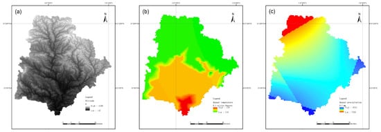 Spatial attributes of the study area (statistics since 1980). (a) The spatial distribution of elevation. (b) The spatial distribution of temperature. (c) The spatial distribution of precipitation.