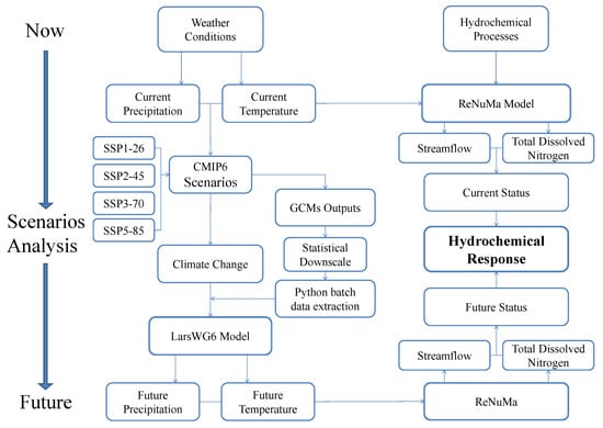 The impacts of future climate changes on watershed hydrochemical processes were assessed based on the newest Shared Socioeconomic Pathways (SSP) scenarios in Coupled Model Intercomparison Project Phase 6 (CMIP6) in the Tianhe River in the middle area of China. The monthly spatial downscaled outputs of General Circulation Models (GCMs) were used, and a new Python procedure was developed to batch pick up site-scale climate change information. A combined modeling approach was proposed to estimate the responses of the streamflow and Total Dissolved Nitrogen (TDN) fluxes to four climate change scenarios during four future periods. The Long Ashton Research Station Weather Generator (LARS-WG) was used to generate synthetic daily weather series, which were further used in the Regional Nutrient Management (ReNuMa) model for scenario analyses of watershed hydrochemical process responses. The results showed that there would be 2–3% decreases in annual streamflow by the end of this century for most scenarios except SSP 1-26. More streamflow is expected in the summer months, responding to most climate change scenarios. The annual TDN fluxes would continue to increase in the future under the uncontrolled climate scenarios, with more non-point source contributions during the high-flow periods in the summer. The intensities of the TDN flux increasing under the emission-controlled climate scenarios would be relatively moderate, with a turning point around the 2070s, indicating that positive climate policies could be effective for mitigating the impacts of future climate changes on watershed hydrochemical processes.