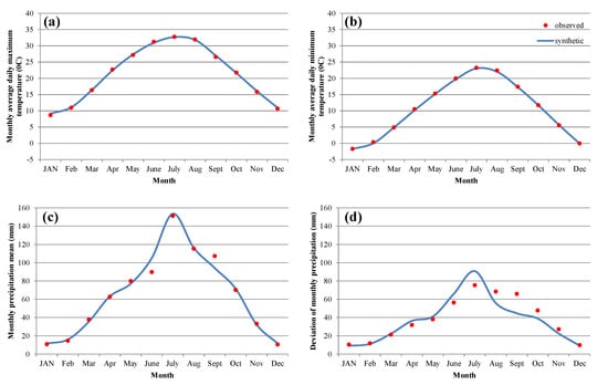 Comparisons of observed and modeled values of precipitation and temperature from the Long Ashton Research Station Weather Generator (LARS-WG). (a) The mean daily maximum temperature for each month. (b) The mean daily minimum temperature for each month. (c) The monthly precipitation for each month. (d) The deviation of monthly precipitation for each month.