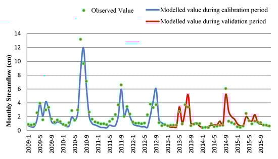 The time series of the monthly modeling streamflow and TDN compared with the observed data are shown in Figure 5 and Figure 6. The results showed relatively good agreement, based on the goodness of fit of the observed and modeled streamflow and TDN flux in this study area. The observed TDN in 2017 is missing due to available data limitations. However, benefiting from the flexible data demands of ReNuMa, it was feasible to use discontinuous observation for calibration and verification. The R2NS and r2 of the streamflow estimation were 0.800 and 0.828 in the calibration period and 0.753 and 0.796 in the validation period, respectively. The modeling accuracy for TDN flux was somewhat lower than that for the streamflow, which is consistent with previous studies [,]; the R2NS and r2 values for TDN flux estimation for the calibration period were 0.748 and 0.751, respectively. For the validation period, the R2NS was 0.716, and the r2 was 0.735. These statistics are in the same range as other watershed model applications for monthly hydrochemical process estimations [,], indicating that the calibrated ReNuMa model is acceptable for further scenario analysis of climate change impacts. Details of the main calibrated ReNuMa transport and nutrient parameters are summarized in the Supplementary Materials. A series of scenario analyses were achieved by using the ReNuMa model based on the synthetic daily series generated by the LARS-WG to estimate the impacts of climate changes on the watershed streamflow and TDN, which were discussed in Section 3.3, Section 3.4, Section 3.5.