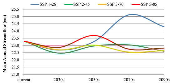 The estimates of the annual streamflow under various SSP scenarios in different future periods are illustrated in Figure 7. There were generally decreasing trends in the annual streamflow yields for most scenarios except SSP 1-26. For the two emission-controlled scenarios of SSP 1-26 and SSP 2-45, the annual streamflow initially decreased around the 2030s and then increased with a peak around the 2070s. The annual streamflow increased 7.83% in the 2070s under the strictly controlled scenario of SSP 1-26. For the two uncontrolled scenarios of SSP3-7.0 and SSP5-8.5, there was a relative peak in annual streamflow around the 2050s and then a decrease to a minimum around the 2070s. The annual streamflow decreased 3.27% in the 2070s under the moderate uncontrolled scenario of SSP 3-70. It was expected that there would be 2–3% decreases in annual streamflow by the end of this century for most scenarios except SSP 1-26, which assumed a strict limitation of warming below 2 °C. These results indicate that the warming trends of climate changes would result in lower water flows in the river channel, which probably result from the severe evapotranspiration that offsets the additional precipitation. Positive climate policies in controlling greenhouse gas emissions to mitigate global warming trends are effective in stabilizing the changes of watershed annual streamflow and benefit local water resource security.