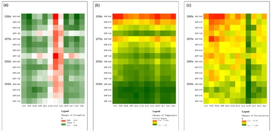 Changes in monthly streamflow, temperature, and precipitation relative to current average monthly values under various climate change scenarios in the future. (a) The changing rates of the streamflow. (b) The amounts of change in temperature. (c) The changing rates of precipitation.