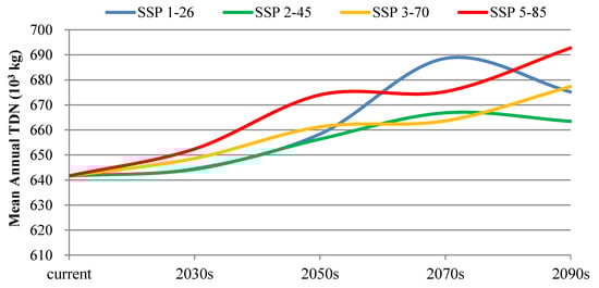 The annual TDN fluxes in the future under different SSP scenarios are shown in Figure 9. It is evident that for all climate change scenarios in CMIP6, the annual TDN flux increased in the future. Continuous increases of the annual TDN flux were observed for the two uncontrolled scenarios of SSP3-7.0 and SSP5-8.5, which led to increases of 5.56% and 7.96% of the annual TDN flux in the study area around the 2090s. The changes in the annual TDN flux under the two emission-controlled scenarios of SSP 1-26 and SSP 2-45 gradually rose first and then fell, with peaks appearing around 2070s. The annual TDN flux in the 2070s increased 7.31% under the strictly controlled scenario of SSP 1-26 and 3.93% under the moderately controlled scenario of SSP 2-45. The annual TDN flux in the 2090s under SSP 1-26 and SSP 2-45 would decrease from the values around the 2070s, indicating positive effects of emission management on TDN flux control. The increased TDN fluxes mainly resulted from the additional non-point source pollution due to the increased transport of TDN associated with increases in the streamflow. More detailed measures concerning non-point pollution control are needed for local environmental management.