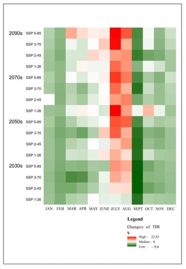The changes in the monthly TDN fluxes in the future were similar to the changes in the monthly streamflow, which are illustrated in Figure 10. Against the increasing background of annual TDN fluxes, most changes in the monthly TDN fluxes were negative during the low-flow period in the winter. The increases in the monthly TDN fluxes in the summer were remarkable in the future. The peak of monthly TDN flux for the emission-controlled scenario of SSP 1-26 would occur in July around the 2070s, with an increase of 17.13% related to the current level. For the worst uncontrolled scenario of SSP 5-85, the peak of the monthly TDN fluxes during the research period could be found in July at the end of this century around the 2090s, with continuously increasing trends implying a worse situation in the next century. In general, the critical issues of TDN flux control in the summer were related to high summertime flows. The main pollution source under the changed climate status should be identified, and efficient measures should be projected to implement the best management practice, as discussed below in Section 3.5.