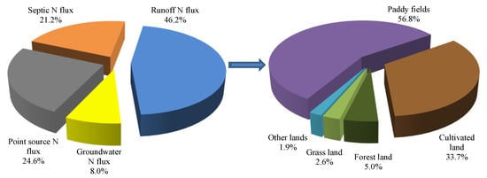 The current source apportionments of TDN in the study’s watershed estimated by ReNuMa are illustrated in Figure 11. There are generally four main routes for TDN loading: surface runoff, groundwater, septic system discharges, and point source discharges. The contributions of the point sources, which are discharged from the municipal sewage treatment plant of Yunxi town in the downstream area, comprised 24.6% of the total. The point source loads mainly include the domestic sewage of urban residents and industrial waste of the factories in Yunxi town. In addition, 21.2% TDN flux came from the septic systems of rural residents distributed in the upstream area. In addition, 8.0% of the TDN flux was contributed from groundwater, mainly resulting from the infiltration of polluted water and dissolutions of soil organic matter. Surface runoff contributed 46.2% of the TDN fluxes, mainly resulting from agricultural activities; 56.8% of the TDN in the runoff was from paddy fields, and 33.7% came from cultivated land, which mainly resulted from fertilizer and manure N in the runoff. A total of 9.5% of the TDN in the runoff came from forested land, grassland, water surfaces, and urban areas, which mainly resulted from atmospheric nitrogen deposition. Generally speaking, it is a mixed polluted watershed with significant non-point sources that may be sensitive to changes in the regional weather features.