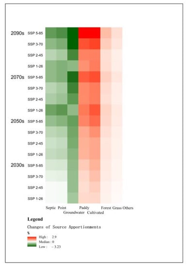 The changes in the source apportionments of TDN under various SSP scenarios in different future periods are shown in Figure 12. The proportions of the TDN loads contributed from natural land would increase, including those of paddy fields, cultivated land, forest land, and grassland. The relative contribution of TDN from the septic system (rural resident livings), point source, and groundwater would decrease. Because the absolute amounts of the point source contributions were assumed to be constant, decreases in their proportional contribution resulted from the increases in the total fluxes of TDN in the future. The impacts of climate changes on the TDN proportions due to groundwater and septic systems were negative. The absolute TDN yields from the septic system were generally steady, and the absolute TDN yields from groundwater were decreasing, which was more remarkable under the uncontrolled scenarios of SSP 3-70 and SSP 5-85 at the end of the 21st century. The changes in the contributing ratios of TDN from other land use areas in the future were negligible.