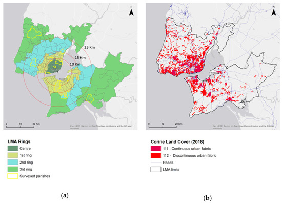 Lisbon Metropolitan Area: (a) Parishes by ring and location of the surveyed parishes; (b) Land use: continuous and discontinuous urban fabric, in 2018.