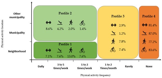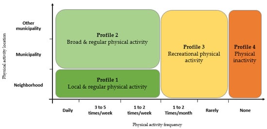 Figure 2. Scheme of physical activity profiles of families.- Profile 1. Local and regular physical activity—representing families that practice a certain activity at least once a week in the neighborhood of residence.