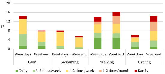 Therefore, it is important to understand how physical activity is present in the daily lives of families. It is observed that practices are differentiated between the days of the week (e.g., prevalence of the search for gyms during the week and the use of bicycles for non-commuting purposes on the weekend, while swimming and walking/trekking/hiking have balanced demands between weekdays and weekends; Figure 3). The frequency of activities is also variable: the search for a gym or swimming pool is quite regular, with visits predominating once or twice a week. On the other hand, walking presents the highest percentage of daily activity (both during the week and weekends). Although cycling registered a less regular demand (1 to 2 times a month or rarely), it appears with some relevance in the weekend.