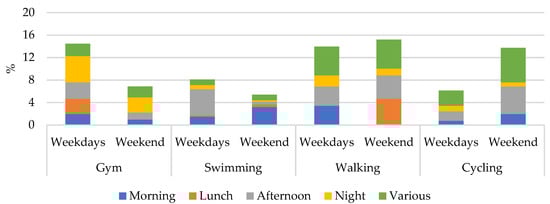 The distribution of activities in the different periods of the day is also distinct (Figure 4). The period selection depends on several factors—the work situation of individuals, the constraint of equipment, and green spaces’ schedules, among others. For example, the search for gyms is highlighted at lunchtime on weekdays (especially as part of working day), but also at night. Swimming is especially popular in the afternoon on weekdays and in the morning on the weekend. Regarding walking and cycling activities, demand is highlighted in the afternoon, regardless of day of the week, and, unlike previous activities, there is a considerable proportion of families in which demand is not just for only one period of the day, but several periods, justified by the reduced schedule limitations in carrying out these activities.