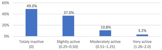 Households with higher incomes demonstrate more active physical activity levels (Figure 8), enhanced, for example, by the ability to purchase material and pay fees, for example, for the gym or swimming pool. It is in the intermediate classes of income that the “Very active” and “Moderately active” families are seen more often.