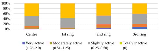 Based on the previous literature review, the urban model could be one of the key factors in promoting physical activity in the daily life of families. As presented in Section 3.1, our sample corresponds to a proportional distribution of surveys based on metropolitan rings. Hence, the results are analyzed based on these rings.