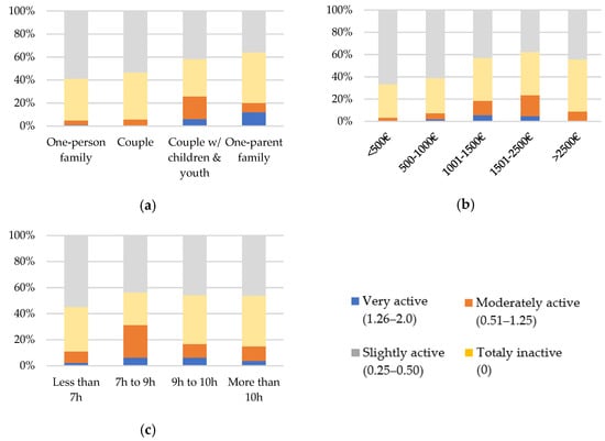 Level of physical activity intensity of families according to: (a) typology of family; (b) monthly income; (c) time out of home.
