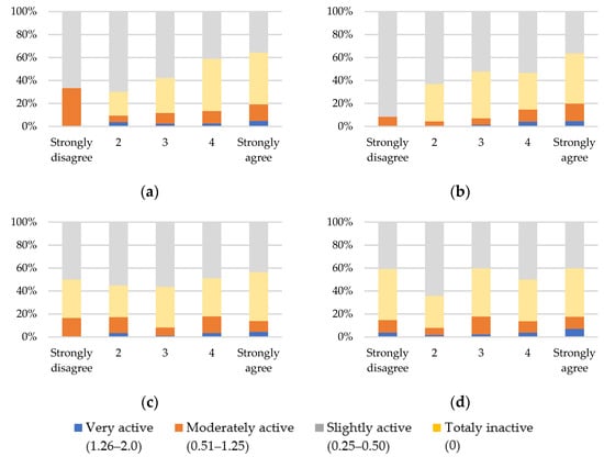 Lastly, perceptions of some individual or territorial aspects can influence the appetence for the practice of physical activity. For example, the self-perception of a good quality of life is revealed to be a positive influence factor on the practice of the analyzed physical activities (Figure 9a,b): there is a higher proportion of families that execute physical activity (even at a slightly active level) within the groups that consider themselves to have a good quality of life, where the “Very active” families emerge. This phenomenon is even more evident when related to self-perception of health level, finding the same pattern: individuals who self-assessed as “healthy person” represent families more likely to practice physical activity.