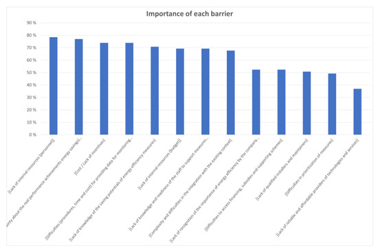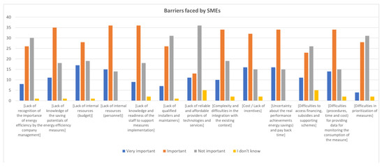 Out of the 65 responses collected from the SMEs, economic barriers were the most evident for the surveyed SMEs (Figure 1). These include obstacles such as lack of personnel, lack of incentives, and the uncertainty about the real performance achievements in terms of energy saving (conditioning the payback time) and were highlighted by 75–80% of the companies. In addition, difficulties (procedures, time, and cost) for providing necessary data for monitoring the measure was also considered a significant barrier with 52% of answers considering it as important and 23% as very important. The integration of energy efficiency with the context of the organization seems to be a significant barrier with 68% of enterprises having claimed difficulties in integration with the production processes and within the actual organization. Additional barriers included lack of qualified experts and not being able to prioritize energy efficiency measures, and this was highlighted by 50% of the respondents. Table 5 shows the opinion of the respondents for each SME barrier. Figure 2 shows the level of importance of each the listed barrier according to the questionnaire where ‘Lack of internal resources for personnel’, ‘Uncertainty about energy savings, ‘Cost’, ‘Difficulties in providing data, and ‘Lack of knowledge about energy savings’ were given the highest level of importance by the SMEs. In particular, it is interesting to note that 50%, i.e., at least 30 of the surveyed companies, declared energy efficiency as not being recognized by the company management.