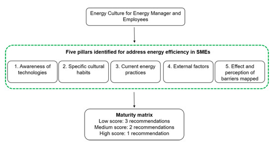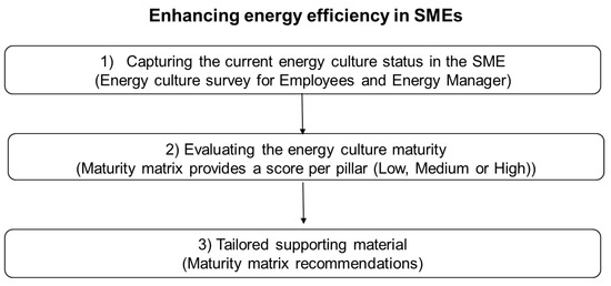 With support from the literature review, direct interviews, knowledge about barriers, and the benefits of incorporating a maturity matrix for teaching and learning purposes, the new approach to enhance energy efficiency in SMEs may be summarized in three steps: (1) capturing the current energy culture status in the SME, (2) evaluating the energy culture maturity, and (3) tailored material (Figure 3).