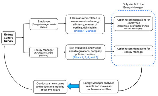 The energy culture survey may be conducted several times over within the SME and can be independently conducted by the Energy Manager himself/herself. By conducting the survey several times, it will be possible to observe the change in maturity of each pillar, for example a pillar may have had a High score but may decline to a Medium or Low score due to various reasons, such as change in managers. Similarly, a pillar may see drastic improvement with more commitment from the managerial staff and more expert knowledge available to the SME. The energy culture survey has been integrated as part of the project platform [54].