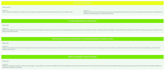 Knowing the various types of barriers that exist within SMEs and by further confirming the existence of barriers through direct discussions and the online questionnaires, there is a need to develop a well-rounded approach that caters to enhancing energy efficiency while also addressing the financial, technical, organizational, and behavioral gaps in SMEs. The fundamental role of a maturity assessment is to capture the company’s own understanding of the present situation [41]. Thus, the maturity matrix may help SMEs to take the next step towards improving and implementing energy efficiency within the companies and it may serve as a continuous learning-teaching tool to avoid mismatches in decision-making, change behavior, increase staff knowledge, and provide expert advice.