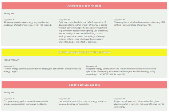 Once the maturity of the pillar (energy culture) was determined, the next step for the SME would be to take the necessary steps for improvement, if needed. For this purpose, a set of energy efficiency recommendations were created corresponding to the final maturity of the pillars. A Low score in any pillar would give three action recommendations, a Medium score will suggest two action recommendations, and a High score in a pillar would give one action recommendation, serving the purpose to maintain the high maturity level of the pillar in this case. Appendix C shows the tailored recommendations.