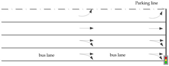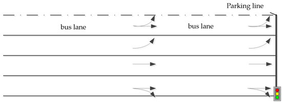 The secondary bus lane model means that the bus lane is set on the side of the secondary road, which is the second lane nearest the curb, as shown in Figure 4. Setting up a secondary bus lane requires that left-turn bus vehicles need to enter the left-turn lane in advance to avoid conflict with straight social vehicles.