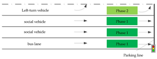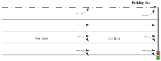 The roadside bus lane means that the bus lane is set on the outermost side of the road, as shown in Figure 2. This type of bus lane not only provides priority for buses turning right but also makes it convenient for buses to stop at bus stops and to turn right; however, straight-on bus vehicles will conflict with right-turning social vehicles when passing through intersections, and left-turning public vehicles and executive social vehicles will produce conflict points, so it is necessary to optimize phase setting and signal timing to reduce the occurrence of conflict points.
