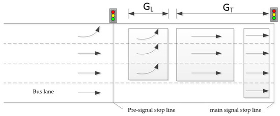The layout of an entrance road without a tandem design is shown in Figure 5; its signal control chart is shown in Figure 6. The layout of the entrance road using this design is shown in Figure 7, which is marked with the main signal and the pre-signal stop line, and the area between the two stop lines is called the “sorting area”. The advance signal upstream lane arrow marks the function of each lane; that is, left-turning vehicles and straight vehicles are driving in different lanes. To simplify the illustration, the right-turning vehicle is not shown in the figure. When the main signal is red, all types of vehicles waiting are rearranged under the control of the pre-signal. The vehicles upstream of the pre-signal enter the “sorting area” according to category; the first ones to enter are buses, followed by straight social vehicles and left-turn vehicles. The area can accommodate temporarily queued vehicles generated by the pre-signal control, and the length of the sorting area is long enough to ensure that the queue does not overflow back to the advance signal. This kind of design is called “tandem design” [13].