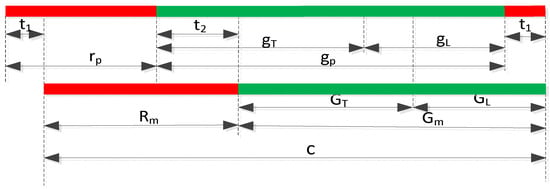 The pre-signal system adopts the “red-first-green” control mode, that is, the pre-signal red light turns on t1, ahead of the main signal red light, and the pre-signal green light turns on t2, ahead of the main signal green light. The timing coordination relationship between the main signal and the pre-signal at the intersection is shown in Figure 8. C represents the period length, rp is the pre-signal red time, and gp is the pre-signal green time, which is composed of gT and gL, where gT and gL are the pre-signal straight green time and the pre-signal left-turn green time, respectively. Rm is the main signal red light length, Gm main signal green time, which is composed of GT and GL, in which GT and GL represent the main signal straight green time and main signal left-turn green time, respectively.