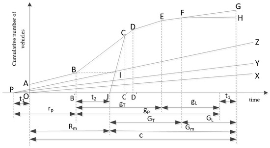 Figure 9 shows the process of the arrival and departure of straight vehicles at the main signal. The slope of the straight line, OX, is the arrival rate of the straight bus, the slope of the straight line, PY, is the arrival rate of the left-turn vehicle, and the slope of the straight line, PZ, is the arrival rate of the straight social vehicle.