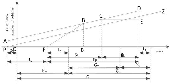 In Formula (23), is the number of straight vehicle entrances at the intersection without a “tandem design” (); is the straight queue vehicle dissipation time (s), i.e., the central section FG of Figure 13.