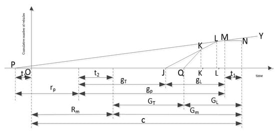 In Equation (3), is the number of entrance lanes at the main signal of the intersection (); at the main signal, the queue dissipation time (s), of straight vehicles at the main signal, that is, the line segment JD’ of Figure 9.