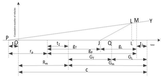 In Formula (29), is the number of left-turn vehicle entrance lanes at the intersection without “tandem design” (); is the time (s), of the left-turn queue waiting for the vehicle to dissipate at the intersection, that is, IJ in the middle section of Figure 14.