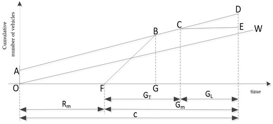 Figure 13 shows the arrival and departure process of straight vehicles at intersections without a “tandem design”. The slope of the straight line OW is the arrival rate of straight vehicles, that is, the sum of the arrival rates of straight social vehicles and straight buses. The straight line, AD, is the arrival process of straight vehicles, and the straight vehicles reach the intersection evenly. The difference between the two is that line AD has the initial cumulative number of vehicles while line OW does not. The broken line, FBCE, is the departure process of straight vehicles, whereby the straight green light is on at the intersection, and the vehicle passes through the intersection at a saturated flow rate until the queue dissipates at the FB stage. In the BC phase, the signal is still in the state of a straight green light, during which the departure rate of straight vehicles at the intersection is equal to the arrival rate of straight vehicles, and this continues until the end of the straight green light. In the CE phase, when the left-turn green light is on, straight vehicles wait in line at the intersection.