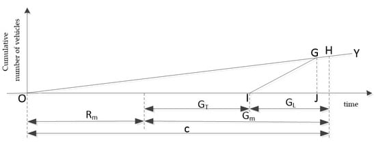 Figure 14 shows the arrival and departure process of left-turn vehicles at intersections without using the “tandem design”. The straight-line OY slope represents the arrival rate of left-turn vehicles. The straight line, OH, indicates the arrival process of the left-turn vehicle, and the left-turn vehicle arrives at the intersection evenly; the broken line, IGH, indicates the departure process of the left-turn vehicle, whereby in the IG phase, the left-turn green light turns on at the intersection, and the vehicle passes through the intersection at saturated flow rate until the queue dissipates. In the GH phase, the signal light is still in a left-turn green state, during which time the left-turn vehicle departure rate is equal to the left-turn vehicle arrival rate and continues until the left-turn green light ends.