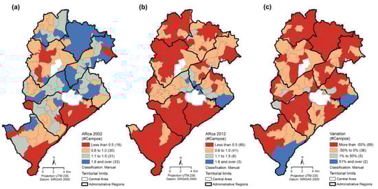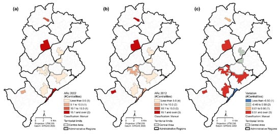 Figure 6a,b). However, when the ARc variations are observed, each territoriality presented different dynamics during the decade that may be construed as a gain or loss of power of attraction in relation to the polarizer center of the Capital city (