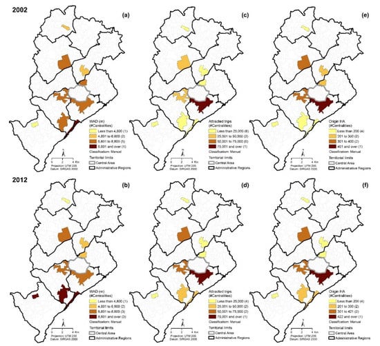 5], comparative analyses were carried out considering three indicators in 2002 and 2012: (1) The Weighted Average Distances (WAD) of the travel flows attracted by each centrality (Equation (2); (2) the total motorized flows attracted by each centrality; (3) number of HAs with origin of the rides heading to the centralities. Finally, aiming at evaluating the greater power of attraction of each centrality, an indicator named Centrality Attraction Ratio (AR