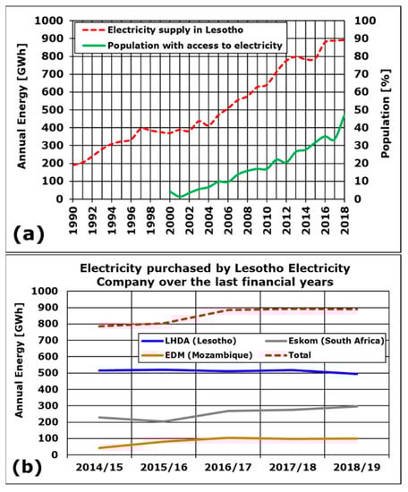 (a) Trend of electricity supply [13,14] and rate of population with access to electricity [16] in Lesotho; (b) electricity purchased for distribution in Lesotho over the last financial years [14].