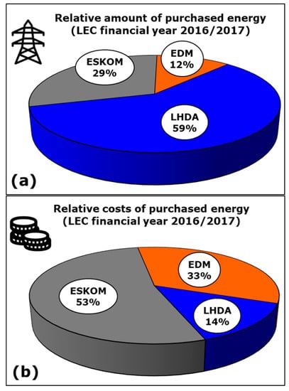 Figure 3a,b, respectively, illustrate the incidence of electricity obtained by different suppliers on the amount of distributed energy and on the costs sustained by the Lesotho Electricity Company (LEC) for the financial year 2016/2017 [15]. It is noted that the cost of imported energy is significantly higher than the cost of internal production, so electricity from LHDA contributes 59% of the total energy demand but only 14% of the total expenses incurred by the utility for procurement of power. According to the same data, the cost of 1 kWh energy imported from South Africa and Mozambique approximately exceeds by 7 and 12 times, respectively, the cost of 1 kWh energy purchased from LHDA.