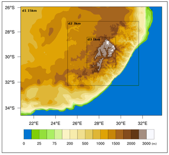 To evaluate the model results, the observational data of wind and solar radiation were collected from the Lesotho authorities to be compared to the corresponding modelled quantities. The period to be simulated was chosen among the more recent years maximising the availability of wind and solar radiation measurements, with a preference on hourly quantities aiming to reproduce the diurnal cycle with the model. Key contributors of observations data were LMS and LHDA. In particular, LHDA provided hourly measurements of radiation and wind at Katse and Mohale dams from 2011 to 2016, while data from LMS came from 13 sites, spanning a larger time period (1980–2015) but on a daily basis and only for two parameters: daily maximum and minimum temperatures and accumulated precipitation. Analysing the collected data, 2015 resulted in being the year with the maximum availability of hourly observations so that it was used to perform the test simulations for the model setup tuning. The three different model configurations tested are listed in Table 1, together with the correspondent number, in brackets, set in the WRF namelist (see for reference WRF model manual, Section 5 [59]).