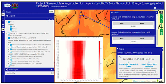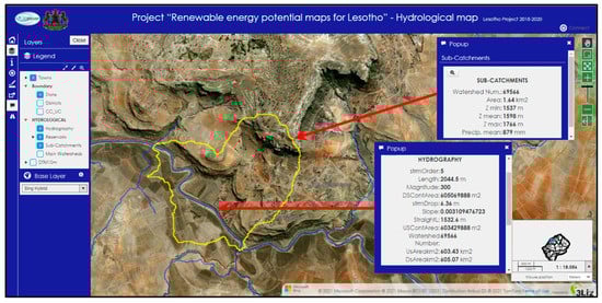 The potential energy maps were embedded in a WebGIS based tool containing further data suitable for the identification of sites which are promising for exploitation. Moreover, other ancillary georeferenced data (i.e., topographic maps, geological maps, land cover, etc.) were separately provided to the stakeholders, as an add-on product. Consistently with the general philosophy of the cooperation program, in order to make the technology transfer easier, free and open-source software was used for the needs of the project, i.e., for meteorological simulations, geoprocessing, and mapping. Indeed, the project promoted capacity building and skills transfer in order to strengthen the local expertise and make the Lesotho Government able to manage the supplied tool.