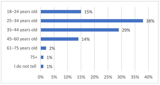 As for the age group of the participants, the highest number of participants was in the 25–34 age group with 38%, and this was followed by the 35–44 age group, with 29% (