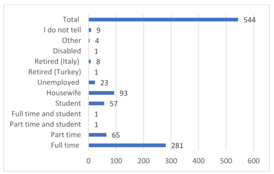 Figure 3). As for the employment status, 53% of the participants were employed full-time, 11% were students, and 17% were housewives, of which 95% came to Italy due to marriage (