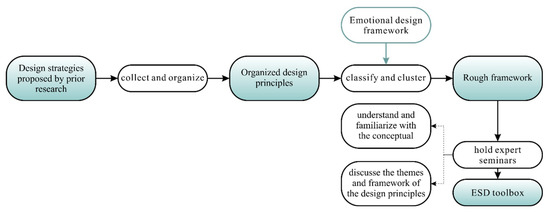 In this section, we describe the development process of the ESD toolbox. As shown in Figure 1, we first systematized the literature on emotionally sustainable product design, collecting and sorting out the relevant design principles. Then, in the process of analyzing and categorizing the design principles, we proposed a rough framework for the toolbox in conjunction with a model of emotional design. Finally, we organized a workshop with experts and designers in the field of sustainability research and emotional design to refine the framework and propose the final ESD toolbox.