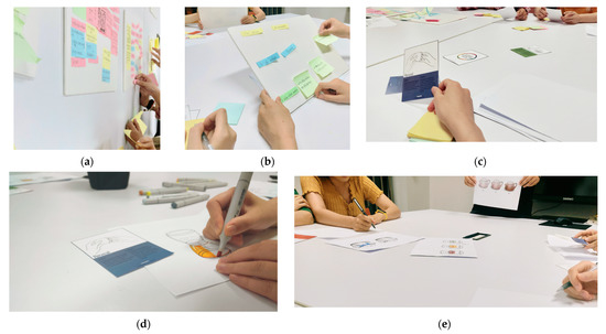 Empathy is the basis for defining and solving problems [52]. Only by really understanding the potential needs of users could the designer find design opportunities. Considering the time and economic cost of the experiment, during the empathetic exploration stage, the researcher conveyed to the participants the emotional needs of the users, which had previously been collected through questionnaires and interviews, but the needs conveyed are unprocessed. Figure 3a shows participants analyzing and arranging user needs by referring to the three emotional levels of the toolbox. The process of analysis and arrangement can enable the participants to understand and digest the needs of users most rapidly.