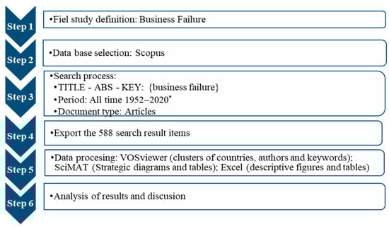 This paper shows the dynamics of general research on the main topics and trends in business failure. For this purpose, and as in bibliometric analyses by other authors [44,101,102], this study followed the following process: (1) definition of the field of study, (2) database selection, (3) research criteria adjustment, (4) export of the final data sample, (5) data processing and (6) results analysis and discussion. Figure 1 summarises the process.
