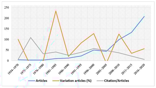 Figure 2 shows the percentage variation of articles published per period, the number of citations per article and the number of articles published in the SCOPUS database, which, as can be seen, have increased considerably in recent years. These results, which coincide with those of previous research [43,113,114], indicate that in the earlier years examined in this work, there was little scientific production on the subject.