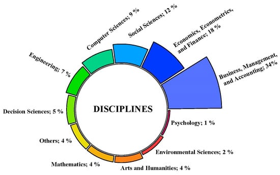 The Scopus database classifies the scientific production on business failure in several essential thematic areas. Figure 3 represents a radial stacked bar plot that indicates that the most relevant scientific area or discipline is business, management and accounting with 33.5% of published papers, followed by economics, econometrics and finance with 17.6%, social sciences with 12.2% and computer science with 9.2%. These four areas account for 72.5% of the total number of articles published. Other areas, among which are engineering, decision sciences, arts and humanities, mathematics and others, account for 27.5% of the published studies.