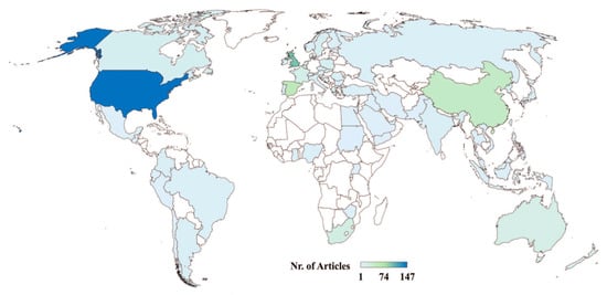 Table 6 details the main characteristics of the 10 countries that contributed the most published articles and their main contributors. The United States tops this ranking with 147 articles, 5212 citations and 44 collaborations, with the United Kingdom, Germany, Sweden and France among the main contributors. The United Kingdom is placed in second place with 97 published articles, 2732 citations and 32 collaborations, mainly with the Netherlands, United States, Spain and China. The latter has a considerable number of citations, i.e., 1256 for only 45 published papers, and 18 collaborations with the United States, United Kingdom, Portugal and South Korea.