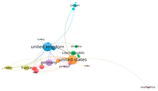 Figure 5 shows a network representing the cooperation among the top 26 countries that published research on business failure. The colour of the circles corresponds to the cluster that encompasses each of the various groups of countries. The size of the spheres reflects the number of papers published per country. Seven different groups can be observed. The countries associated with the red colour are Canada, Greece, Italy, New Zealand and Poland. The green cluster, headed by the Czech Republic, also includes Japan, Romania, Slovakia and South Korea. The blue group is led by the United Kingdom, with Belgium, the Netherlands and Turkey as collaborators. The yellow group is led by France, together with Argentina, Colombia and Spain. The purple group comprises China, Germany and Portugal. India, Sweden and the United States are grouped in orange. Finally, Nigeria and South Africa make up the brown cluster.